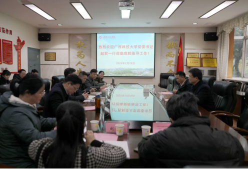 2月20日下午,广西科技大学党委书记赵君就tyc5997太阳集团的建设与发展来校展开调研与交流。双方在我校E125会议室举行了专题座谈会,共同探讨tyc5997太阳集团发展的新路径与新方向。我校党委书记黄昕,党政办公室、宣传部、tyc5997太阳集团相关负责人,tyc5997太阳集团各教研室主任参加会议。会议由党政办公室主任邓学源主持。