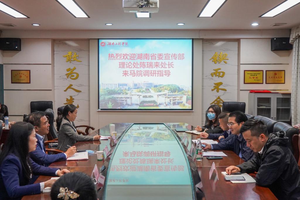 10月6日下午,省委宣传部理论处处长陈瑞来到tyc5997太阳集团调研指导工作,座谈会在tyc5997太阳集团会议室举行,党委书记陈岳堂、副校长向前、tyc5997太阳集团领导班子成员、全体无课教师参加了座谈会。