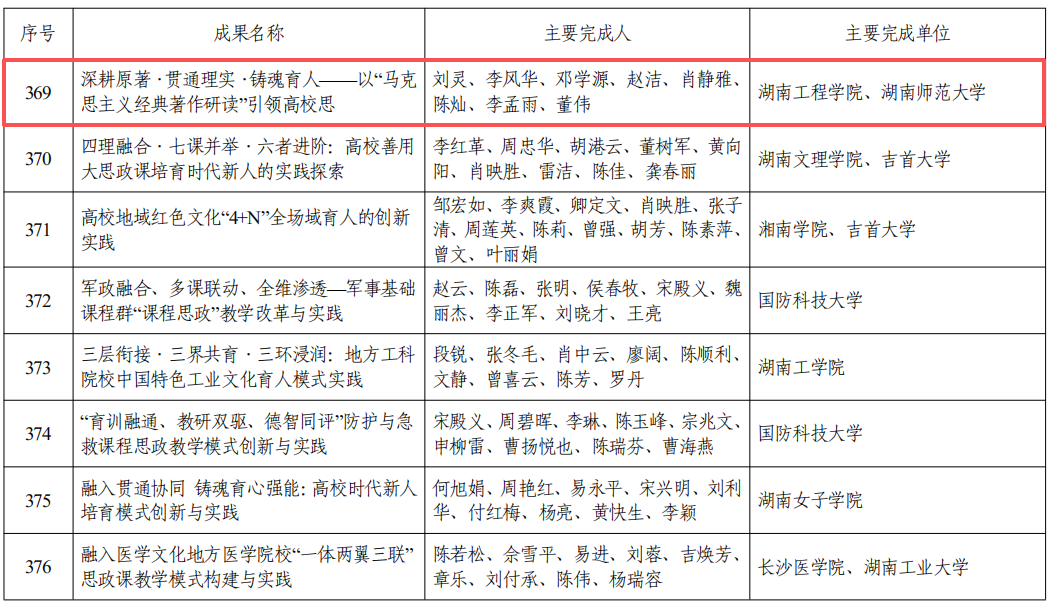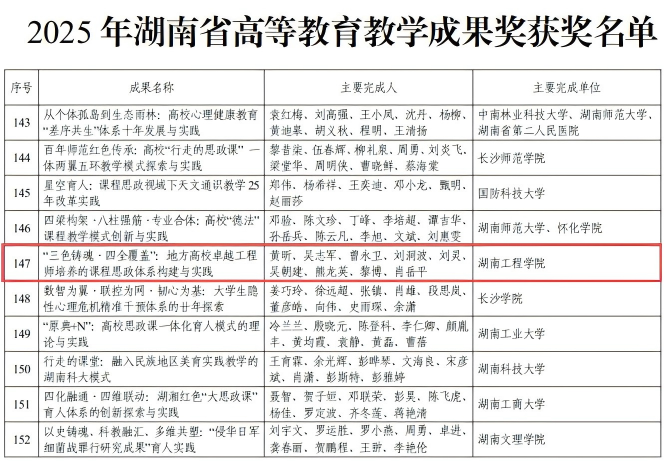 近日,湖南省教育厅公布了2025年高等教育教学成果奖获奖名单。黄昕教授领衔团队的《“三色铸魂·四全覆盖”:地方高校卓越工程师培养的课程思政体系构建与实践》(序号147)获一等奖;刘灵教授领衔团队的《深耕原著·贯通理实·铸魂育人—以“马克思主义经典著作研读”引领高校思政“金课”建设与探索》(序号369)获二等奖。