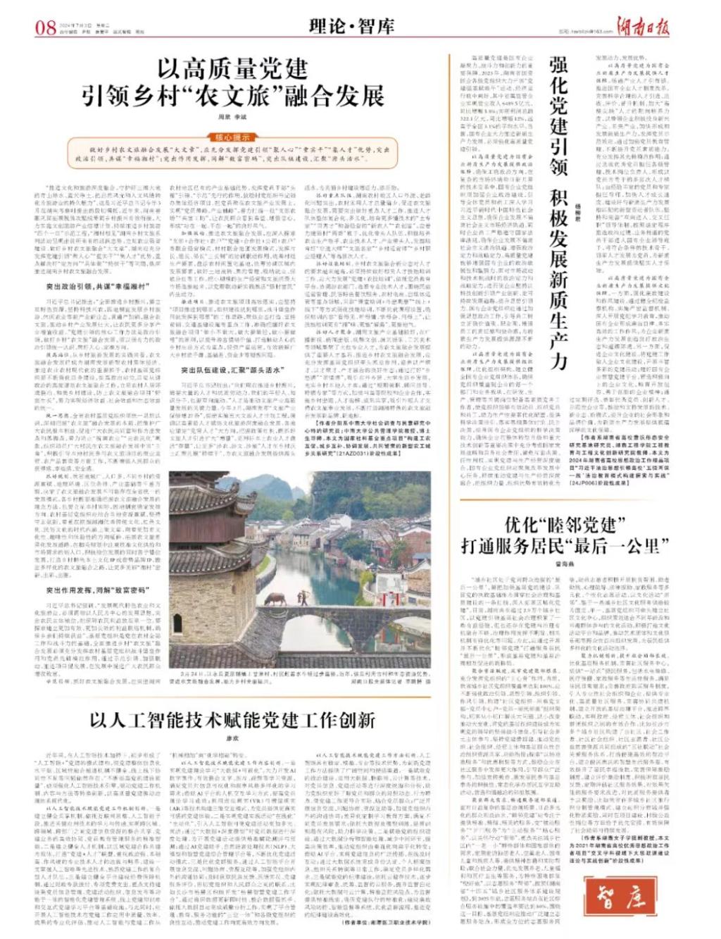我院杨柳君老师在《湖南日报》“理论·智库”(2024年7月3日)发表文章《强化党建引领 积极发展新质生产力》。文章指出,高质量党建是国有企业凝聚力、战斗力和创新力的重要保障。国有企业大力推进新质生产力发展,必须强化高质量党建引领。以高质量党建为国有企业新质生产力发展提供政治保障、组织保障、人才保障、文化保障。