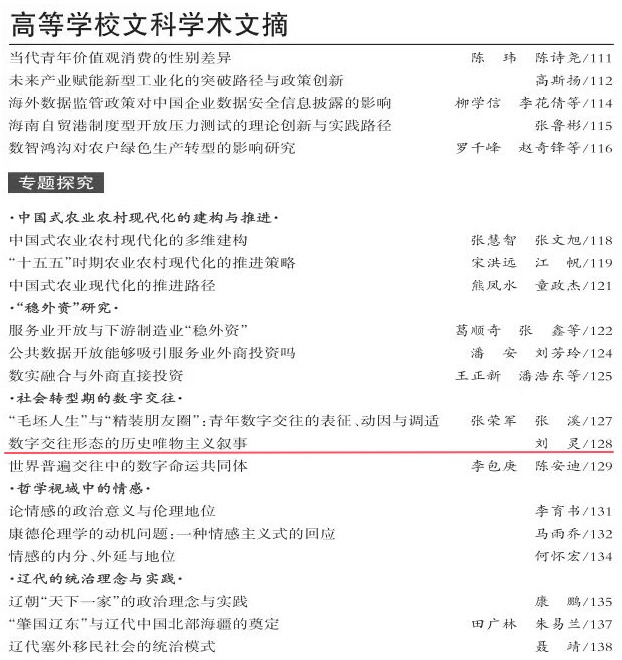 近日,我院刘灵教授独撰的学术论文《数字交往形态的历史唯物主义叙事》获《高等学校文科学术文摘》2025年第10期全文转载。该文原载于《湖南科技大学学报(社会科学版)》2025年第4期。
