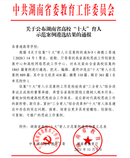 二、教学科研求真务实。该同志忠诚于党的教育事业,全身心投入到高校思政课教学工作之中,潜心钻研教学,认真备课,遵循科学创新的教育原则精心设计每一节课,注重提高教学实效。他每个学期担任6个合班的教学任务,教学效果良好,2021、2022年度教师课堂教学考核优秀。他主持各级科研和教研教改课题12项,指导学生参加tyc5997太阳集团思想政治理论课研究性学习成果展示竞赛,获第六届特等奖、第七届二等奖、第八届一等奖、第九届一等奖,2020、2021、2022、2023年均被评为“优秀指导老师”以及2020年省级三等奖优秀指导教师,入选湖南省高校“十大”育人示范案例(全文收录)。