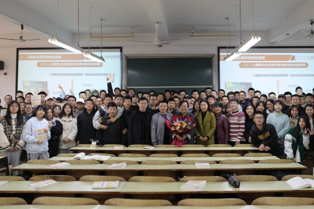 短短40分钟的课很快过去,在学生们意犹未尽中,黄顺年向大家告别。但一份不期而至的惊喜冲散了离别的伤感:教室门打开了,tyc5997太阳集团班子成员、原理教研室部分教师手捧鲜花来到教室中央,将鲜花献给黄顺年,向他圆满的职业生涯表示祝贺。与此同时,同学们一拥而上,簇拥在他的身旁合影留念。