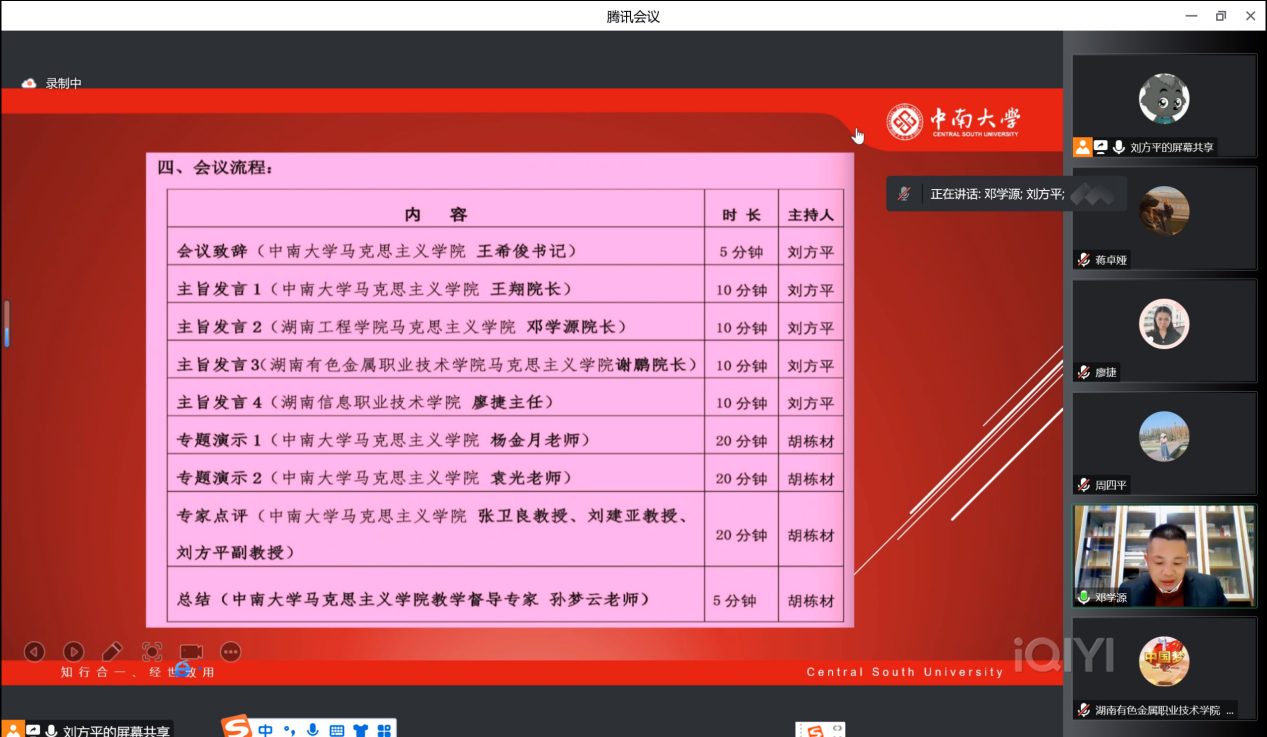 本次联合备课在线上线下同步举行,会议内容包括会议致辞、主旨发言、专题演示、专家点评、教学督导总结五个环节。中南大学tyc5997太阳集团党委书记王希俊在会议致辞并全程出席。中南大学tyc5997太阳集团王翔院长、tyc5997太阳集团邓学源院长、湖南有色金属职业技术学院tyc5997太阳集团谢鹏院长、湖南信息职业技术学院廖捷主任进行了主旨发言。中南大学tyc5997太阳集团杨金月老师和袁光老师进行了专题演示。中南大学tyc5997太阳集团张卫良教授、刘建亚教授、刘方平副教授对本次备课会进行点评。备课会由中南大学tyc5997太阳集团教学督导专家孙梦云老师进行总结。中南大学tyc5997太阳集团习近平新时代中国特色社会主义思想概论教研中心主任刘方平副教授、形势与政策教研中心主任胡栋材副教授联合主持了本次备课会。